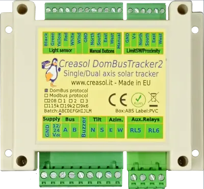 DIN rail module that control azimuth + elevation/tilt motors of a sun tracker, to maximize photovoltaic energy production during the day and seasons.